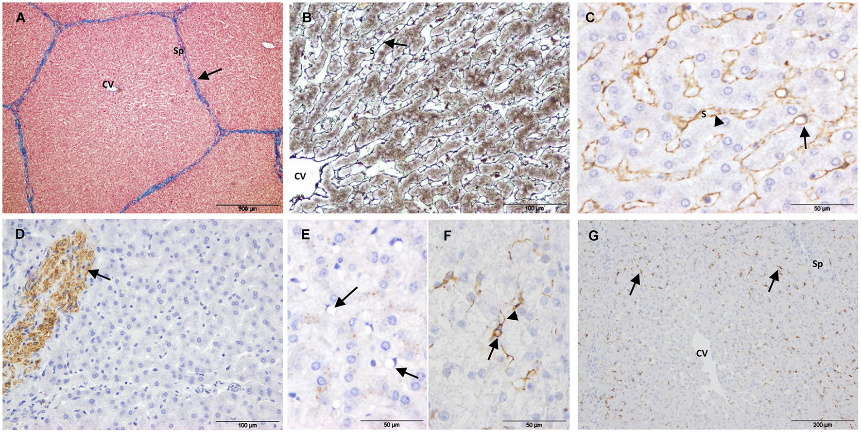 Control samples. (A–E) Non-electroporated porcine liver. (A) Mason's trichrome stain showing collagen in the portal tracts and septa (arrow). (B) Reticulin stain showing reticulin fibers in the space of Disse (arrow). (C) SMA immunostaining showing positive HSCs. The arrow points to the body of a positive cell with a large vacuole and a dislocated nucleus. The arrow-heads point to cytoplasmic processes lining the sinusoids. (D) GFAP immunostaining showing positive nerve fibers (arrow). (E) Desmin immunostaining showing negative HSCs (arrows). (F,G) Desmin immunostaining of untreated liver tissue from electoporated liver. (F) HSC showing immunostaining in the perinuclear cytoplasm (arrow) extending into cytoplasmic processes (arrow-head). (G) Desmin positive HSCs located on the periphery of the lobules (arrows). (CV) Central vein, (Sp) Septum, (S) Sinusoid.