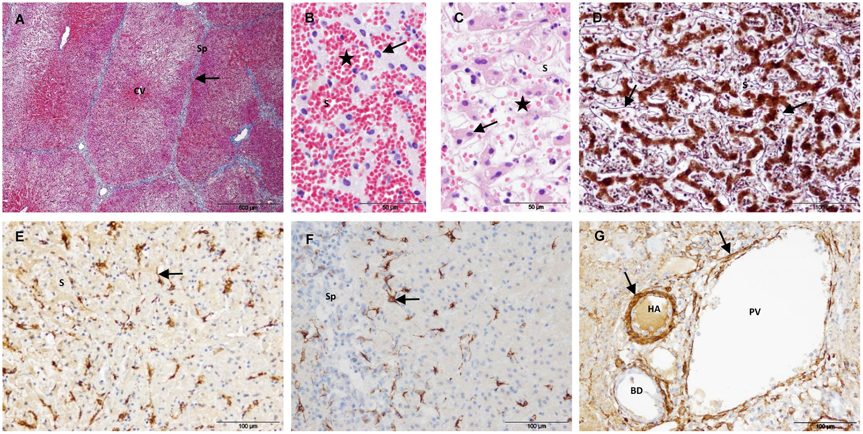 Treated tissue from Group 1 livers (1 day after IRE). (A) Mason's trichrome stain showing preserved collagen in the portal tracts and septa (arrow). (B,C) H&E stain showing signs of cell death (arrows) and an inhomogeneous congestion of sinusoids (stars). (D) Reticulin stain showing preserved reticulin fibers in the space of Disse (arrows). (E) SMA immunostaining showing positive HSC with short cytoplasmic processes (arrow). (F) Desmin immunostaining showing positive HSC located on the periphery of the lobules (arrow). (G) SMA immunostaining showing preserved vascular muscle cells in a portal tract (arrows). (CV) Central vein, (Sp) Septum, (S) Sinusoid, (HA) Hepatic artery, (PV) Portal venule, (BD) Bile duct.
