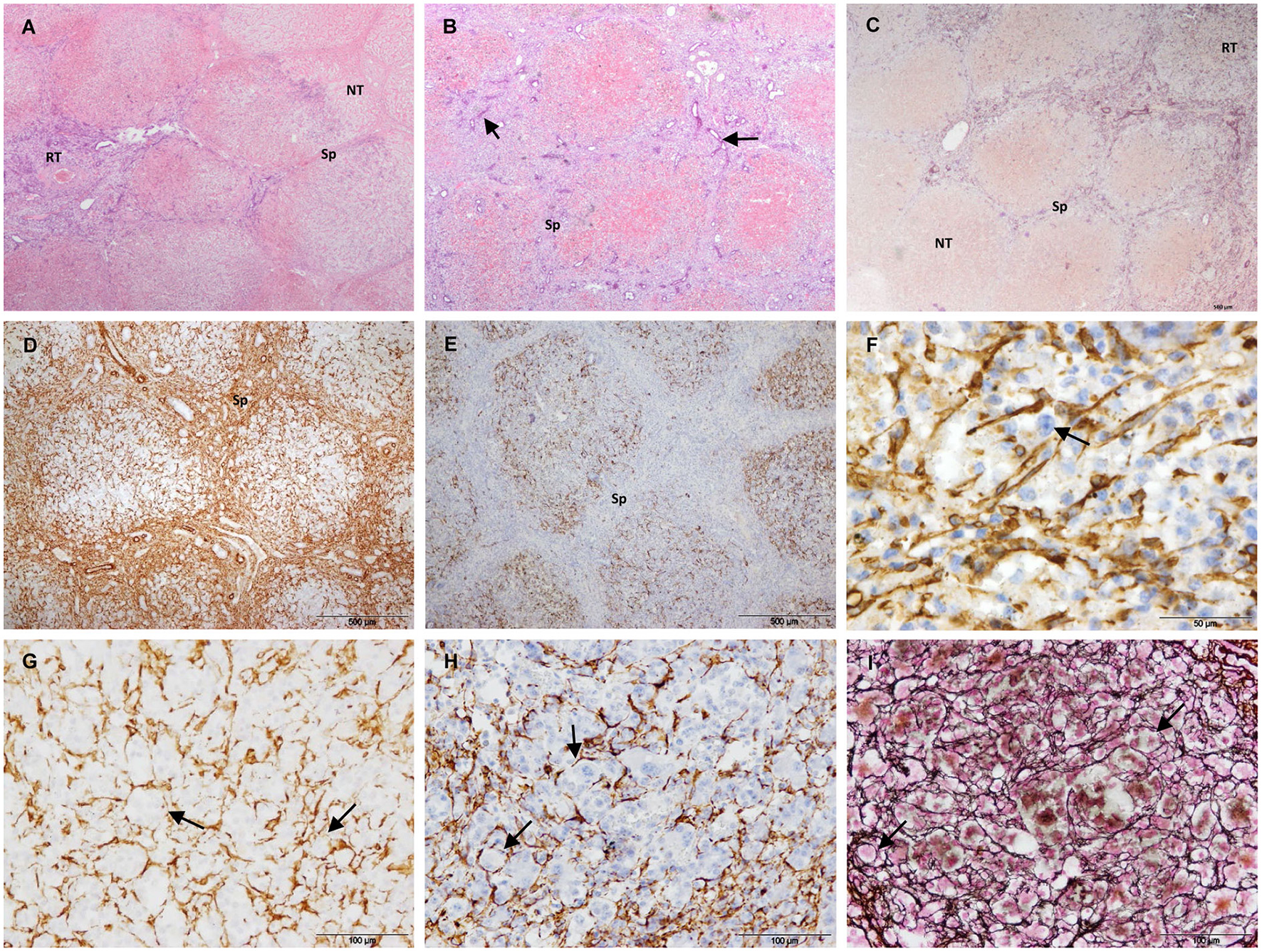 Treated tissue from Group 2 livers (3 days after IRE). (A) H&E stain showing the coexistence of an extensive necrosis with reparative tissue. (B–I) Histology of the reparative zone. (B) H&E stain showing enlarged septa with an intense ductular reaction (arrows). (C) SMA immunostaining. In the limit with the necrotic zone positive cells seemed to move toward this zone through preserved septa. (D) SMA immunostaining showing an intense immunolabeling in the enlarged septa and within the lobules. (E) Desmin immunostaining showing almost no immunolabeling in the enlarged septa but positive cells within the lobules. (F) SMA immunostaining showing elongated positive cells within a lobule. Negative round cells can be also observed (arrow). Within the lobules, (G) SMA- and (H) desmin immunostaining, and (I) reticulin patterns were similar and appeared to outline individual cells and round structures (arrows). (Sp) Septum, (NT) necrotic tissue, (RT) reparative tissue.