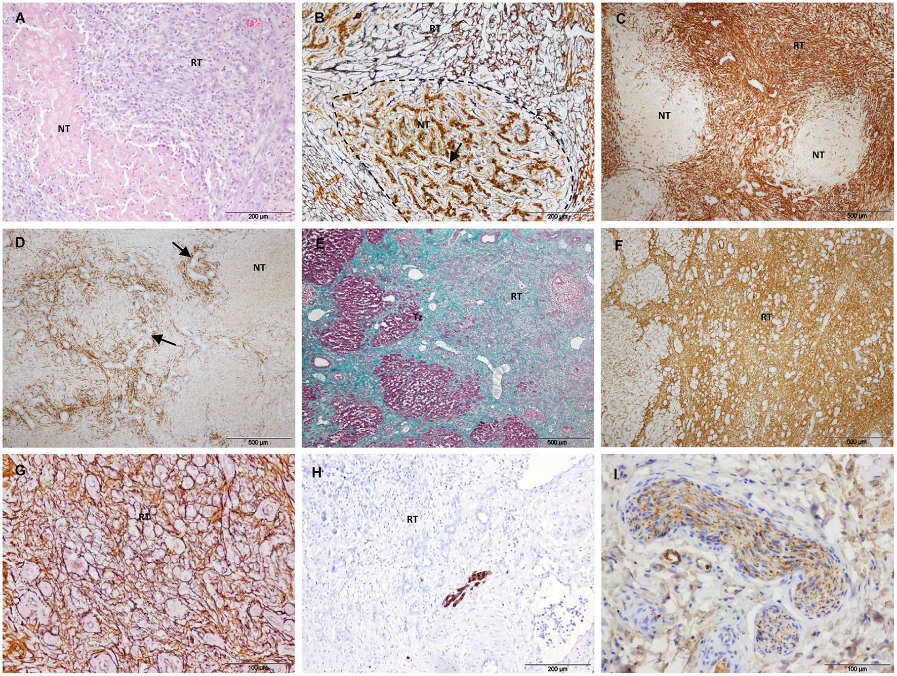 Treated tissue from Group 2 livers (7/14 days after IRE). (A–D) Histology of the core of the electroporated sample. (A) H&E stain showing a small focus of necrosis surrounded by reparative tissue. (B) Reticulin stain showing preserved reticulin fibers (arrow) with a trabecular pattern in a focus of necrosis (delineated section) and a disorganized pattern in the surrounding reparative tissue. (C) SMA immunostaining showing foci of necrosis surrounded by intense immunolabeled reparative tissue. (D) Desmin immunostaining showing desmin immunostaining in the septa around necrotic foci associated with ductular proliferative reaction (arrows). (E–G) Histology of the transition sample. (E) Mason's trichrome stain showing a massive increase in collagen in the reparative tissue. (F) SMA immunostaining showing an intense immunostaining in the reparative tissue. (G) Reticulin stain showing a complete disorganization of the normal trabecular reticulin pattern in the reparative tissue. (H) GFAP and (I) Synaptophisin immunostaining showing positive nerve fibers in the reparative tissue. (NT) necrotic tissue, (RT) reparative tissue.