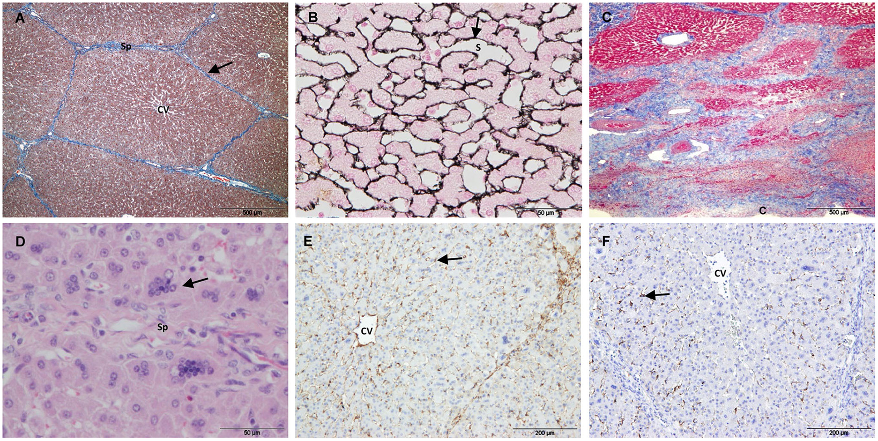 Treated tissue from Group 3 livers (14/21 days after IRE). (A) Mason's trichrome and (B) reticulin stain showing normal liver architecture, with collagen in the portal tracts and septa (arrow) and reticulin fibers in the space of Disse (arrow). (C) Mason's trichrome showing subcapsular fibrosis. (D) H&E stain showing multinucleated hepatocytes (arrow). (E) SMA immunostaining showing positive HSCs within the lobules (arrow). (F) Desmin positive HSCs located on the periphery of the lobules (arrow). (CV) Central vein, (Sp) Septum, (S) Sinusoid, (C) Capsule.