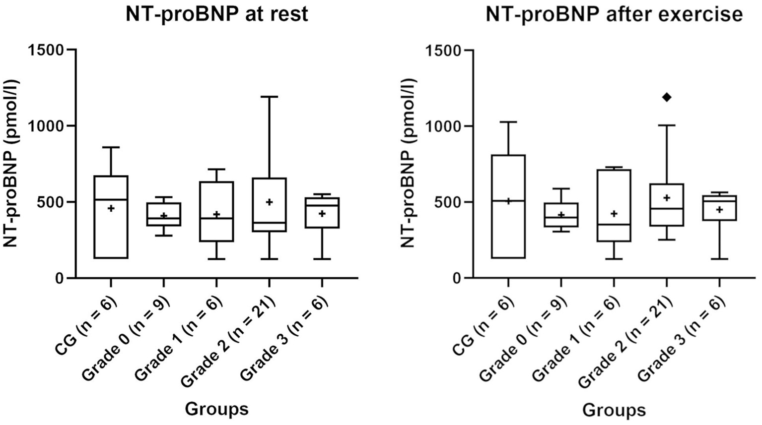 NT-proBNP values of the control group (CG) and groups of pugs subdivided into BOAS grades 0–3 at rest and after exercise. Boxes contain values from 1st to 3rd quartile, lines inside boxes indicate median values, + inside the boxes represents the mean, endpoints of vertical lines are limited to a maximum of 1.5 times the interquartile range, and ♦ represents the outliers.