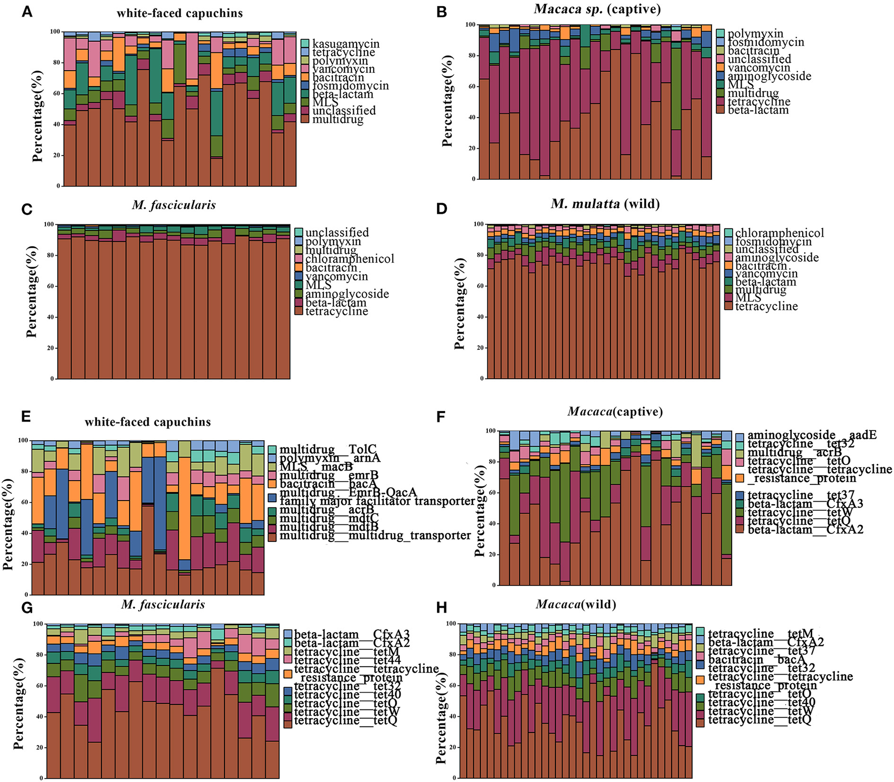 Relative abundances of top 10 type and subtype ARGs. (A) The top 10 antibiotic resistance class of white-faced capuchins. (B) The top 10 antibiotic resistance class of Macaca sp. (captive). (C) The top 10 antibiotic resistance class of M. fascicularis. (D) The top 10 antibiotic resistance class of M. mulatta (wild). (E) The top 10 antibiotic resistance gene of white-faced capuchins. (F) The top 10 antibiotic resistance gene of Macaca sp. (G) The top 10 antibiotic resistance gene of M. fascicularis. (H) The top 10 antibiotic resistance gene of M. mulatta (wild).