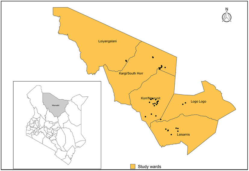 Map showing the position of Marsabit County within Kenya (Left), Laisamis sub-county and wards included in the study indicating all sampled villages (Black dots). Shapefile source: GADM.