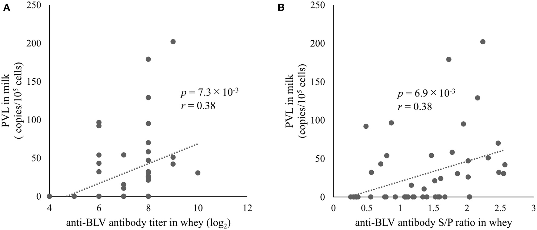 The correlation between anti-bovine leukemia virus (BLV) antibody in whey and BLV proviral load (PVL) in milk. Anti-BLV antibody titers and S/P ratios at 32-fold dilution in whey were measured using an anti-BLV antibody ELISA. The PVLs in milk were measured using the CoCoMo-qPCR-2 method (RIKEN Genesis, Kanagawa, Japan). (A) The correlation between anti-BLV antibody titer in whey and BLV PVL in milk (n = 49). (B) The correlation between anti-BLV antibody S/P ratios at 32-fold dilution in whey and BLV PVL in milk (n = 49).