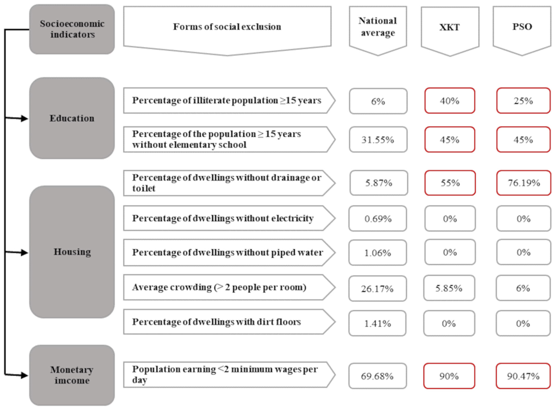 Conceptual scheme of social marginalization of two Mayan communities of Yucatan, México. Here we compared the national average of each of the exclusion forms, design for the National Population Council of Mexico to measure social marginalization (20), with the two Mayan communities studied. We can observe in red the collected data that exceeds the national average. XKT, Xkalakdzonot; PSO, Paraiso.