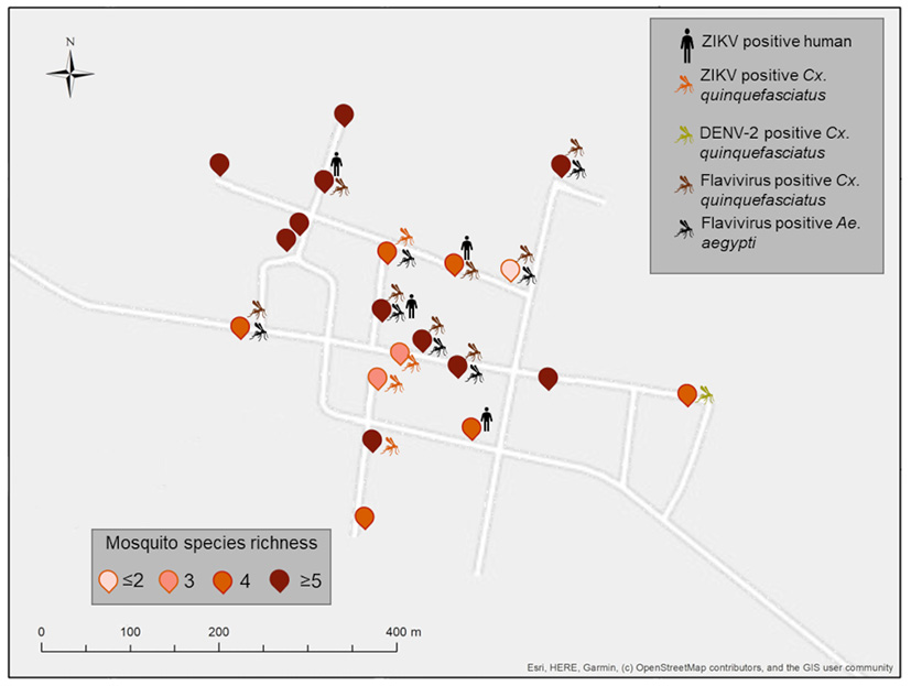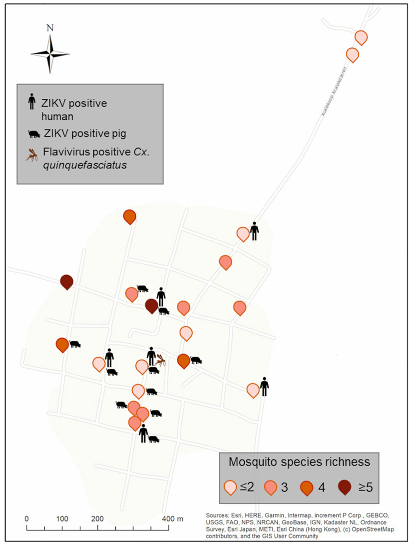 Spatial distribution of ZIKV-positive pools of vertebrates and flavivirus positive mosquitoes from Xkalakdzonot (XKT), Yucatan, Mexico. Positive households include the icons of vertebrates or mosquito pools positive in each dwelling. Mosquito species identity for each household is shown in Supplementary Table 2. Map coordinates were removed to protect the privacy of the patients involved.