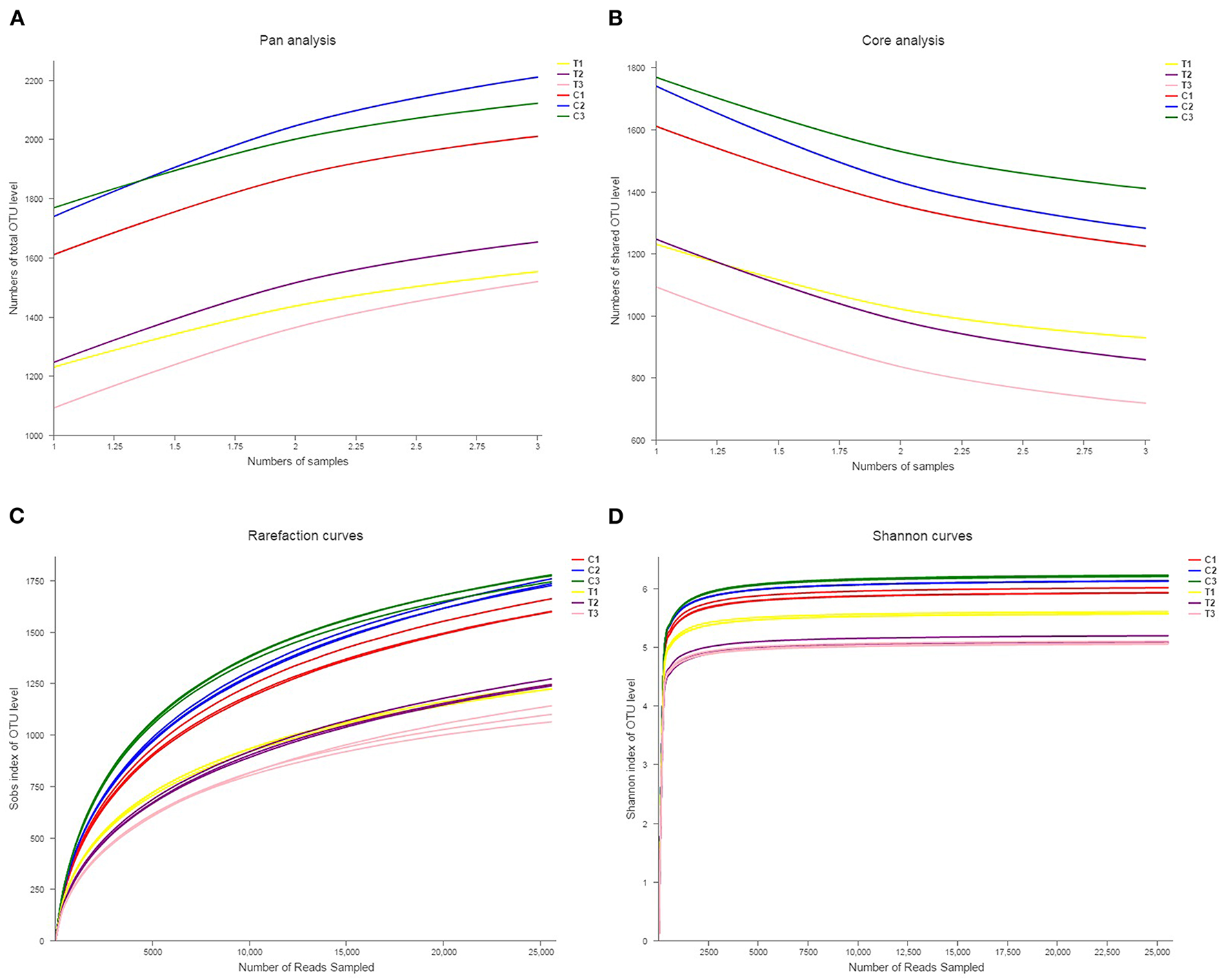 Pan-core species analysis was used to analyze total species and core species richness (A, B). The rarefaction curve was drawn to quantify the soils' OTU richness (C, D). All data in the experiment represent three independent experiments.
