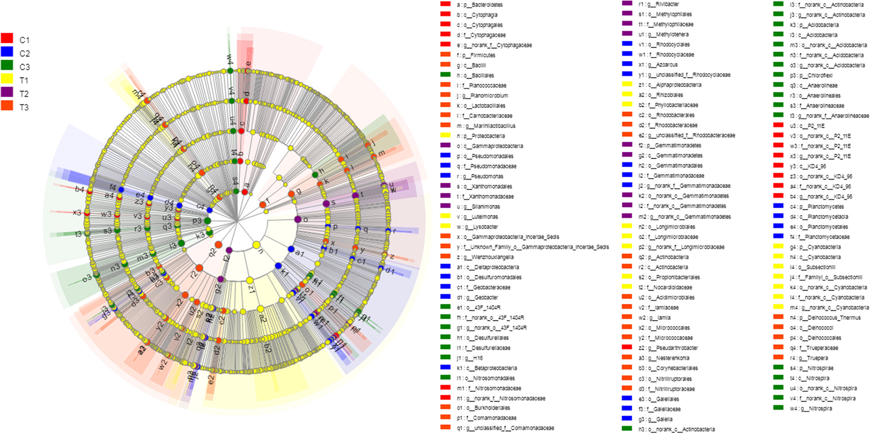 LEfSe was used to discriminate the microbial communities of all soil samples. Significantly affected microbial taxa were shown in LEfSe multi-level species hierarchy tree diagram. All data in the experiment represent three independent experiments.