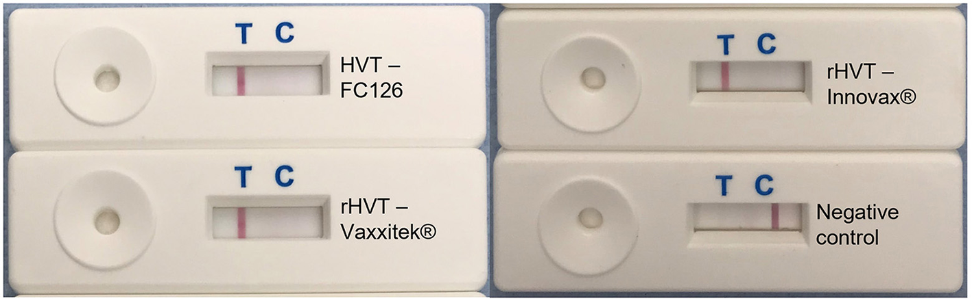 The purpose of the current work was to develop HVT-specific LAMP-LFD assays, and to validate these to test field samples in a controlled laboratory setting. Herein, we describe the modification of a previously reported HVT-specific LAMP assay (37), to allow detection of dual-labeled LAMP products with commercially available LFDs. In addition, a novel LAMP assay able to specifically detect the recombinant HVT vaccine VAXXITEK® HVT + IBD was developed and validated. Finally, crude DNA extracted from samples of chicken organs, feathers and poultry house dust subjected to a heat treatment, bypassing the extraction of genomic DNA with commercial extraction kits, was shown to be suitable for virus-specific detection in HVT LAMP-LFD assays.