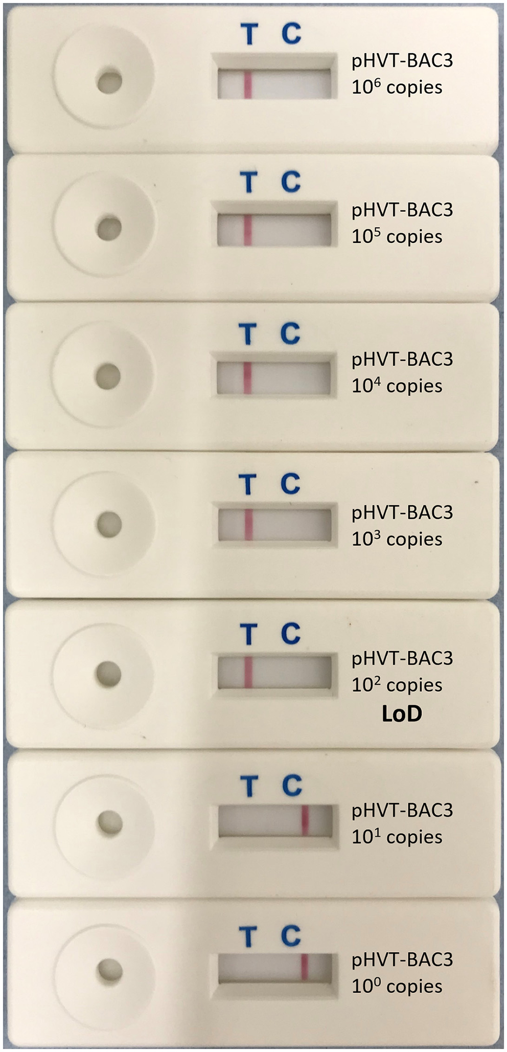 Limit of detection of HVT LAMP-LFD assay. The limit of detection (LoD) was tested using 10-fold serial dilutions of the pHVT-BAC 3 plasmid containing a known number of copies of the HVT genome (100-106). This was repeated in triplicate (replicates not shown). A band at the test line (T) shows a positive result. A band at the control line (C) shows a negative result. The LoD was 102 copies of the HVT genome.
