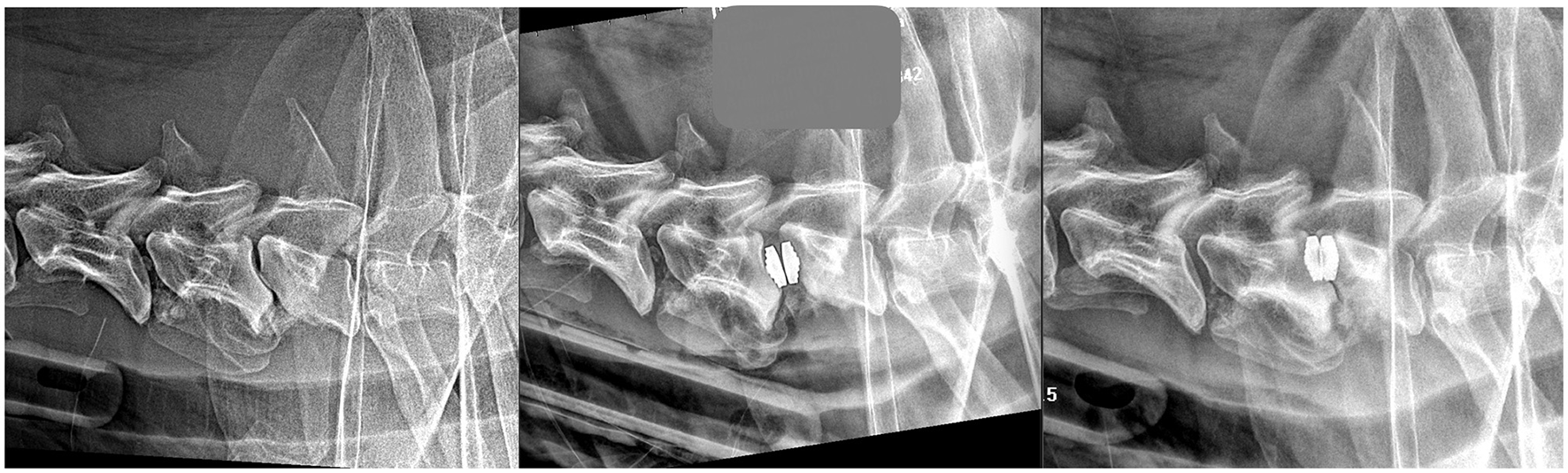 Dogs were placed in dorsal recumbency for the ventral slot. The decision to make a full or partial ventral slot in the treated spaces depended on the presence or absence of residual cord compression on the post-traction MRI images. Before performing the ventral slot, a self-retaining Caspar distractor was used to distract the affected spaces. A full slot was used in dogs with residual cord compression after traction to access the vertebral canal and remove the protruded disc until the spinal cord was visible. A partial slot was used in dogs with completely resolved cord compression after traction to access and thin the inner layer of the annulus, without entering the vertebral canal. Adamo's prosthetic disc (PD) implantation or distraction-stabilization (DS) followed the ventral slot. DS was performed using an intervertebral cage (Cervlock®, PorteVet, size 1: length 15 mm and width 7 mm) and two ventral titanium locking plates of 2.7 mm (PAX Locking System®, Securos). The cages were titanium and filled with freeze-dried and reconstituted bovine bone (Bio-Oss®, Geistlich biomaterials). Bone graft was also placed above the cage itself. After routine closure, DS cases were placed in sternal recumbency and a routine dorsal approach was performed to the affected vertebral articulation. Transarticular fixation was added by placing a titanium screw across each articular facet (2.7 mm or 3.5 mm according to the size of the facet). The facets were covered with the bovine bone graft for the DS procedure (40, 49).