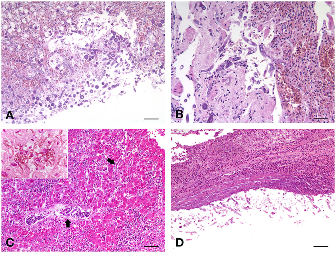 (A) Fischer's lovebird (Agapornis fischeri). Lung parenchyma with the invasive presence of poorly septate large mycotic hyphae, with large sporangiophore, simply spherical and hat-shaped, in the absence of rhizoids relative to the sporangiophores. H&E, scale bar = 250 μm. (B) Peach-faced lovebird (Agapornis roseicollis). Lungs characterized by acute congestion and some areas of parenchyma consolidation, with the presence of mycotic hyphae. H&E, scale bar = 100 μm. (C) Blue and Gold macaw (Ara ararauna), male. Branching septate fungal hyphae were observed in the liver. H&E, scale bar = 250 μm. Insert, scale bar = 50 μm. (D) Blue and Gold macaw (Ara ararauna), female. Long, septate, branched hyphae were observed also in the kidney, both at the level of the serosa and in the parenchyma. H&E, scale bar = 250 μm.