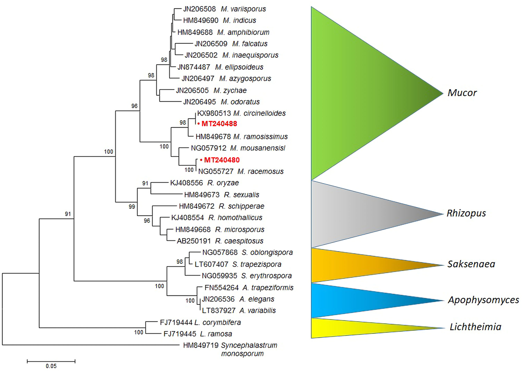 MEGA6 neighbor-joining tree of the Mucorales and related species (Mucor, Rhizopus, Saksenaea, Apophysomyces and Lichtheimia) based on LSU sequences (28S rRNA). Bootstrap values shown at the main nodes represent the probabilities based on 1,000 replicates. Sequence of Syncephalastrum monosporum was used as an outgroup. The sequences produced by our study are highlighted in bold red.