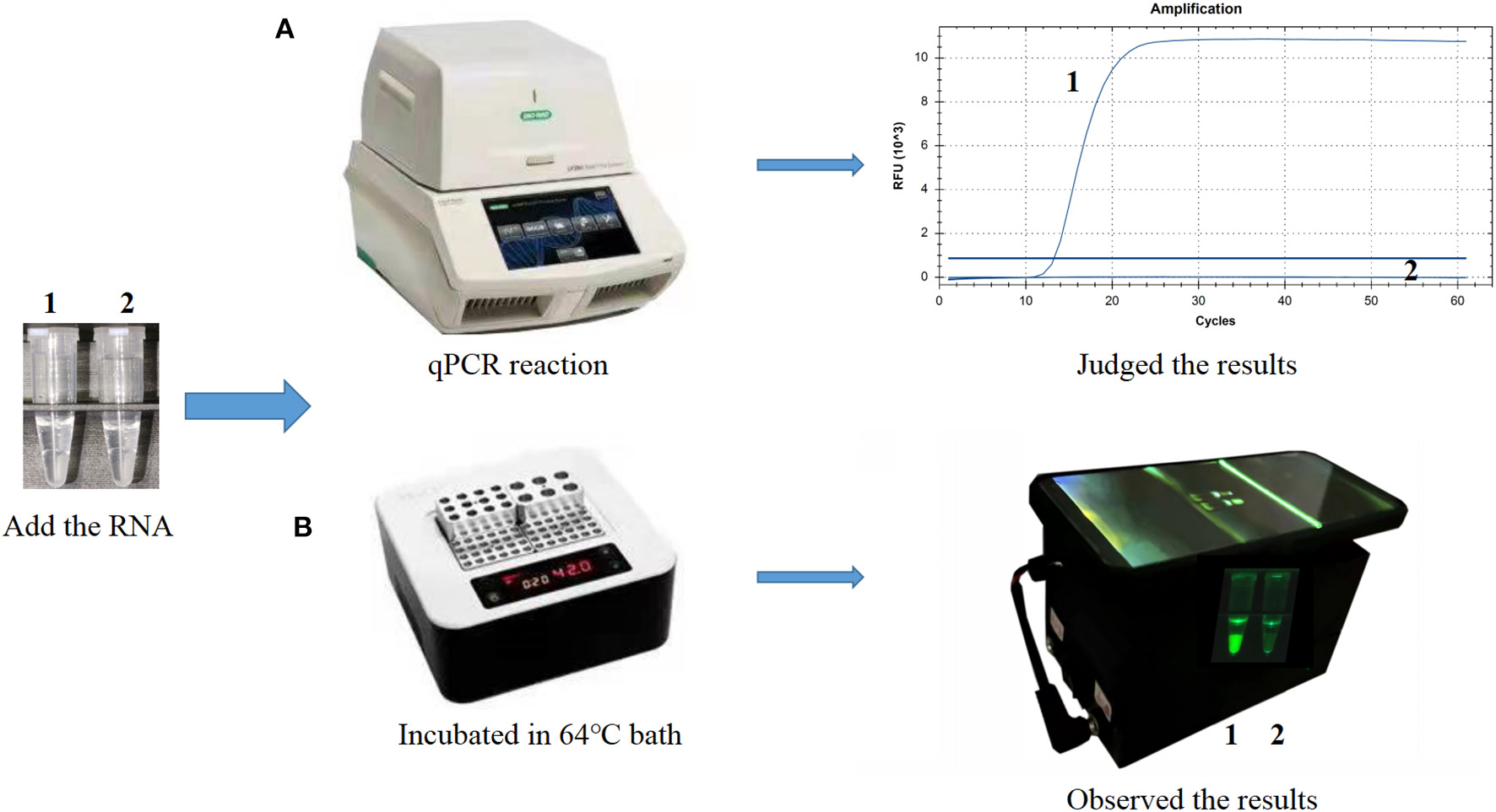 A portable and hand-held 3D-printed device was designed for visual inspection of results; it is a cassette with the lower part containing a power supply area and the upper part containing a detection area. The device is powered by a lithium battery and contains eight LED lights. A 495 nm filter is placed directly above the light, and an Eppendorf tube can be placed directly above the filter. An Eppendorf tube containing the reaction mixture was placed in a metal bath for ensuring a constant temperature reaction and then placed in the cassette. When the power is turned on, 495 nm light excites the fluorophores in the reaction mixture and the results can be visualized using a smartphone.