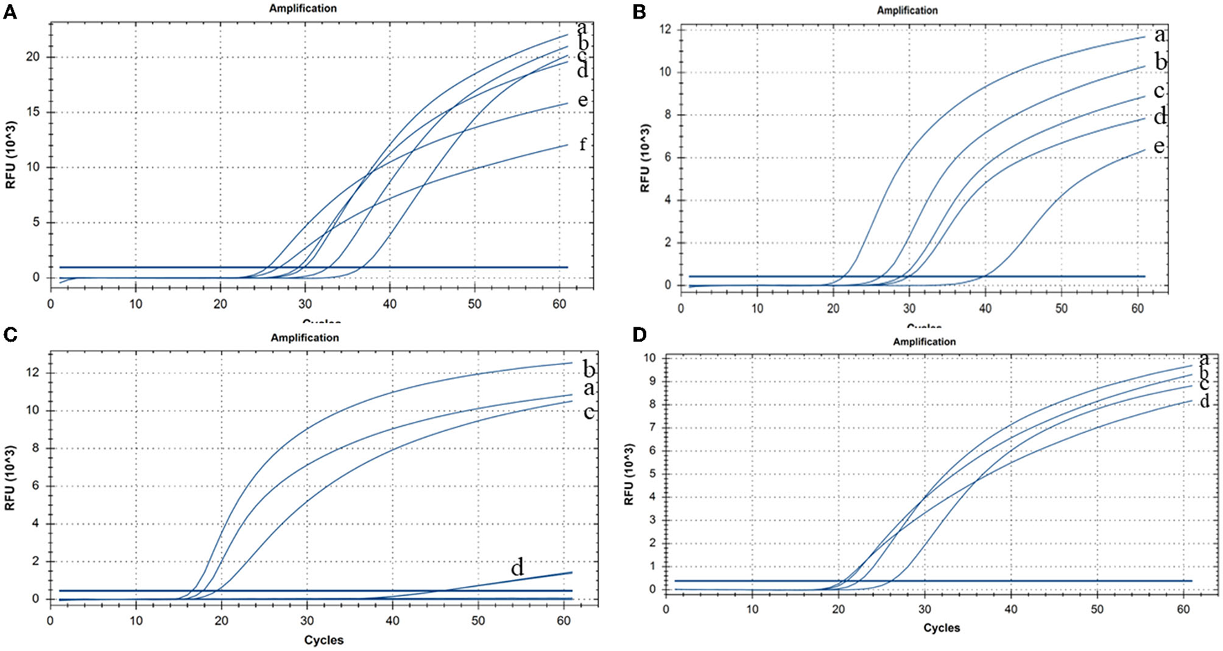 Cleaved probe-based reverse transcription loop-mediated isothermal amplification (CP-RT-LAMP) assay optimization (A) Temperature: (a) 63°C, (b) 61°C, (c) 62°C, (d) 60°C, (e) 64°C, and (f) 65°C. (B) Concentration of dNTPs: (a) 2.4 mM, (b) 2 mM, (c) 1.6 mM, (d) 1.4 mM, and (e) 1.2 mM. (C) Concentration of MgSO4: (a) 8 mM, (b) 6 mM, (c) 4 mM, and (d) 2 mM. (D) Concentration of the loop primer probe: (a) 0.08 μM, (b) 0.12 μM, (c) 0.04 μM, and (d) 0.16 μM.