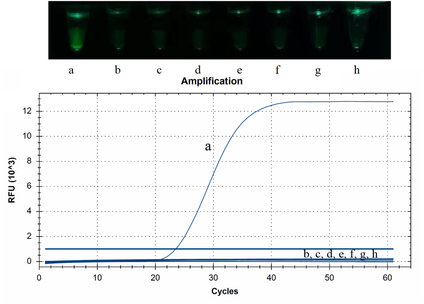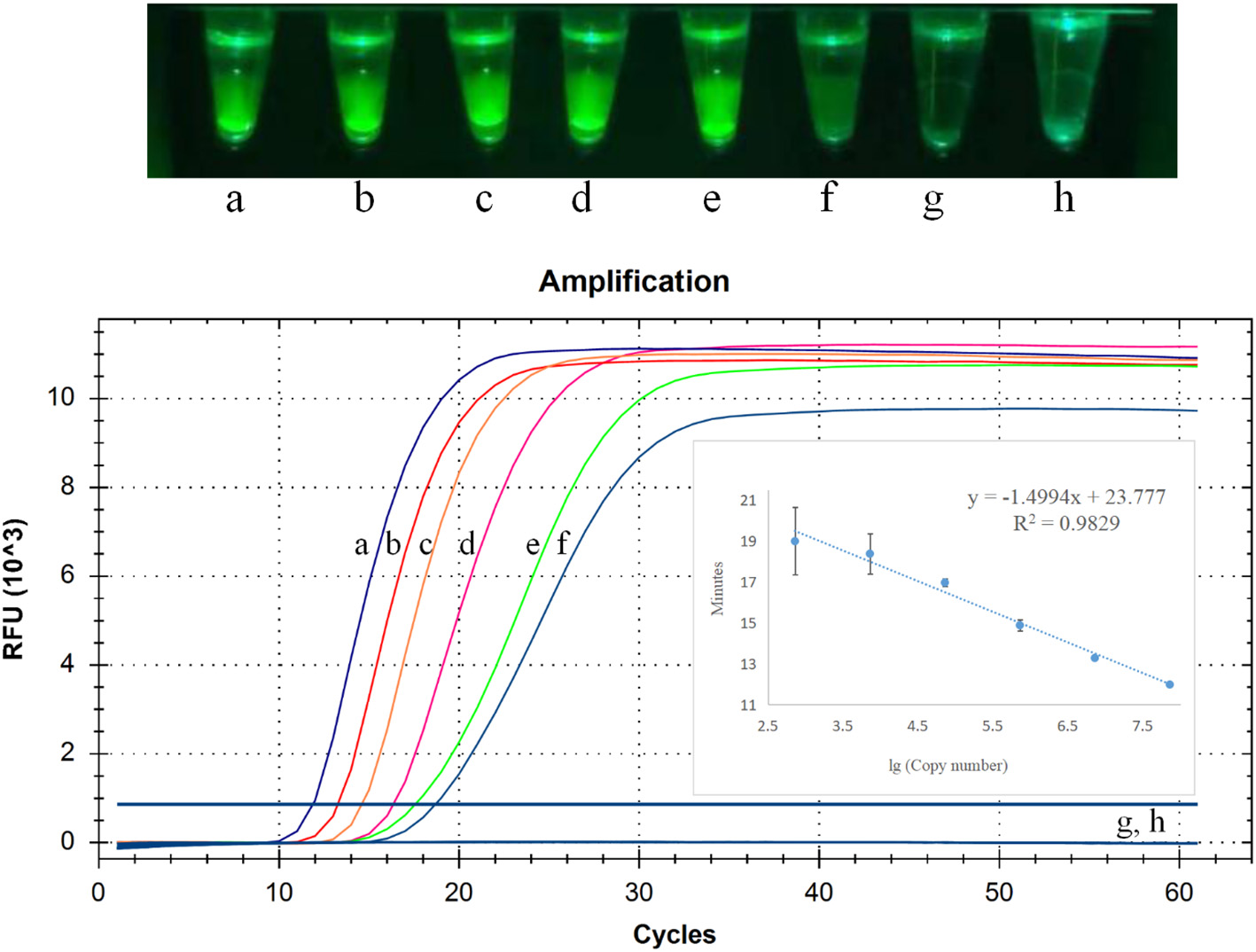 Limit of detection of cleaved probe-based reverse transcription loop-mediated isothermal amplification (CP-RT-LAMP) assay. Serially diluted standard RNA of porcine deltacoronavirus (PDCoV) was used at the following concentrations: (a) 2.5 × 106 copies/μL, (b) 2.5 × 105 copies/μL, (c) 2.5 × 104 copies/μL, (d) 2.5 × 103 copies/μL, (e) 2.5 × 102copies/μL, (f) 2.5 × 101 copies/μL, (g) 2.5 × 100 copies/μL, (h) negative control.