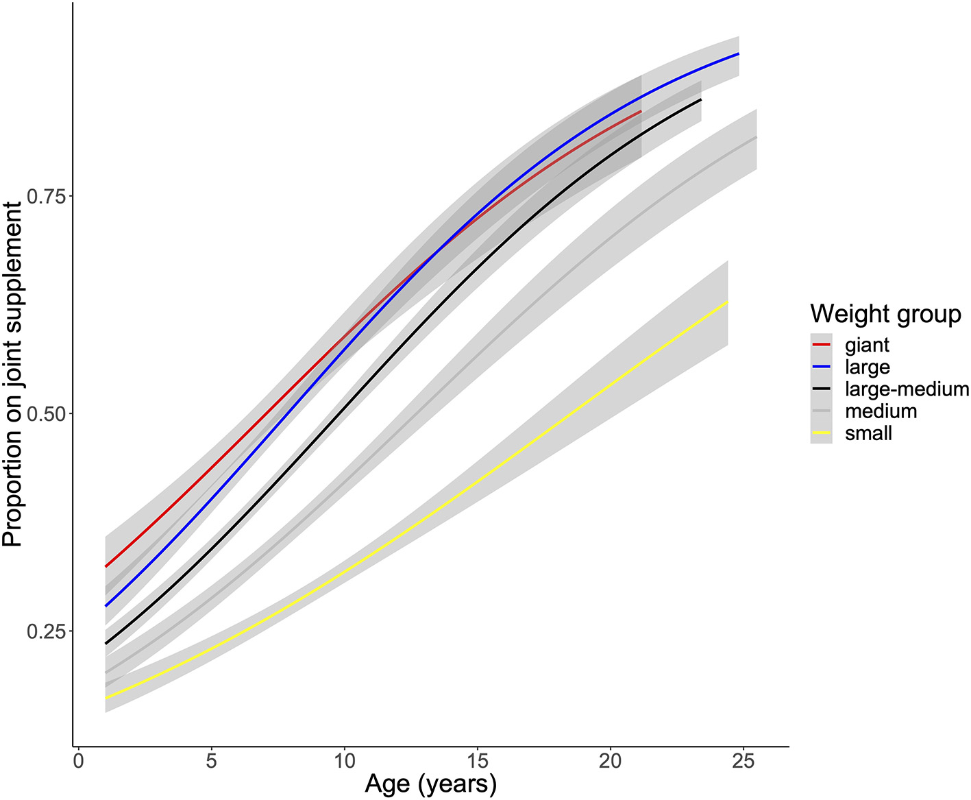 Figure 1. Association of age and weight with joint supplement use in the Dog Aging Project cross sectional cohort. Age associations on joint supplement use were run with a logistic model for each weight class separately.