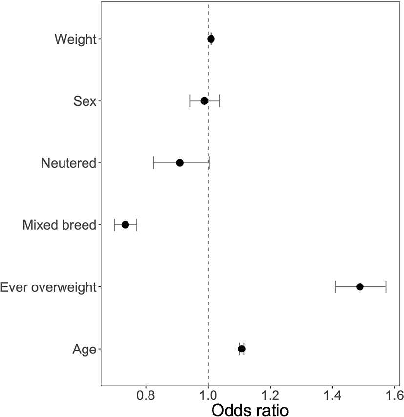 We then used a stepwise AIC approach to determine a combined model from the significant dog and owner factors that were associated with joint supplement use, using those individual factors that were significant in univariate analysis. For dog demographics, we found weight, age, pure/mixed breed, and ever overweight were included in our stepwise AIC model (Supplementary Table S1). When looking at purebreds only, the final model from the stepwise approach included age, breed, and ever-overweight status, with weight group no longer improving the model over the individual breed with active (i.e., border collie) and large (e.g., German Shepherd and Doberman Pinscher) breeds being administered joint supplements in much higher proportions than small breeds. In our owner demographic analysis, all four factors were included in the final model resulting from the stepwise approach: owner age, owner education, owner environment, and food fed. Finally, we looked at those factors that were associated with joint supplement use in dogs or owners to combine into a “best fit” model of all factors. In this combined model, dog age, weight, ever overweight, and purebred were included, as were owner education, age, and food type fed (Supplementary Table S1).