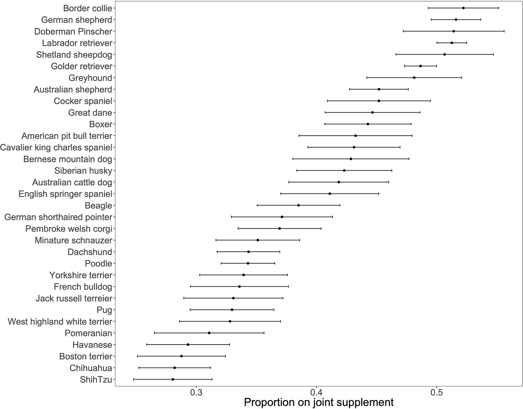 Figure 3. Proportion of individual breeds on a joint supplement. N = 33 breeds with over 100 dogs. Error bars denote standard errors of a proportion.