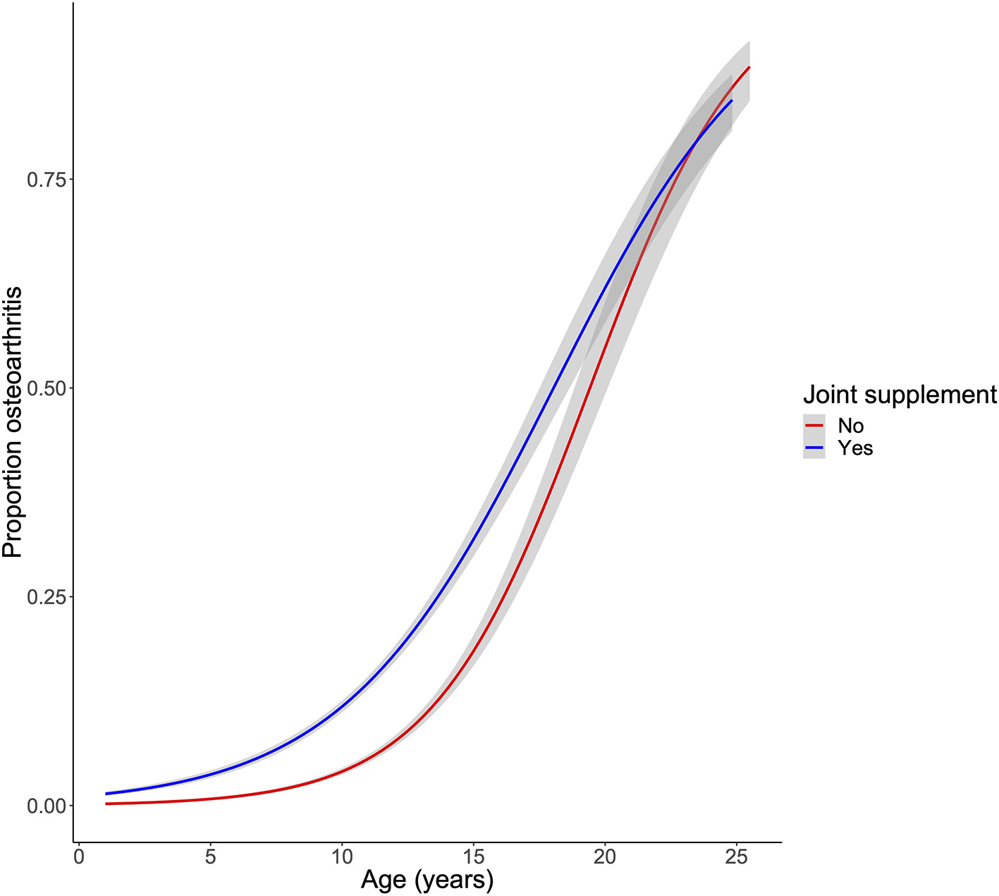 Figure 4. Association of joint supplement use with a clinical diagnosis of osteoarthritis. OA was fit as a logistic regression of age and joint supplement use.