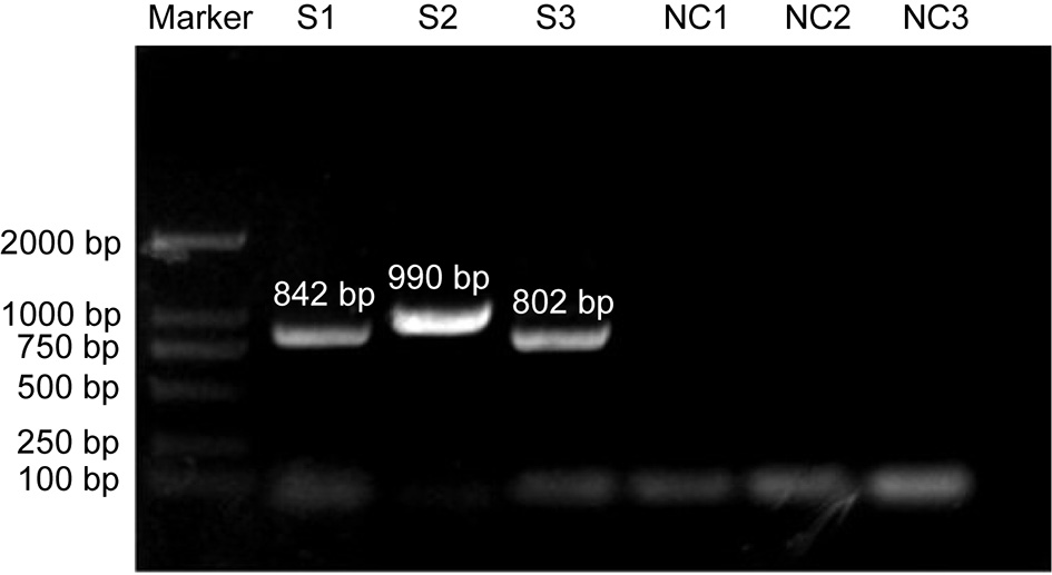 According to the sequence published in the GenBank, three primers were designed to amplify the sample DNA using DNAStar 6.0 application. The primers are shown in Table 1. The amplification procedure was as follows: 94°C for 5 min; 94°C for 30 s, 55°C for 30 s, and 72°C for 30 s (34 cycles); 72°C for 10 min (35 cycles); and 4°C. The PCR products were identified using 1% agarose gel electrophoresis and stained with ethidium bromide. The bands were purified with an Omega gel recovery and purification kit (Omega Bio-Tek, Norcross, GA, USA), and the recovered target fragments were attached to the pMD18-T vector (Takara, Dalian, Chian). After overnight ligation at 16°C, the ligation products were transformed into competent cells of E. coli DH5α (Takara, Japan), and the positive clones were screened. Finally, the bacterial liquid identified as positive by PCR was sent to Shanghai Bioengineering Co., Ltd. for sequencing.