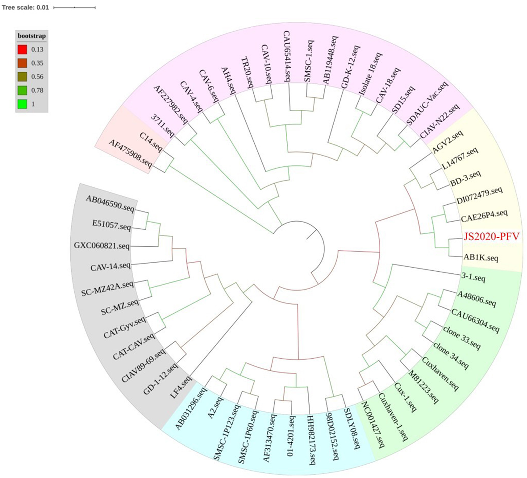 | JS2020-PFV | 2020 China | Chicken | MW234428 | 2296 bp |