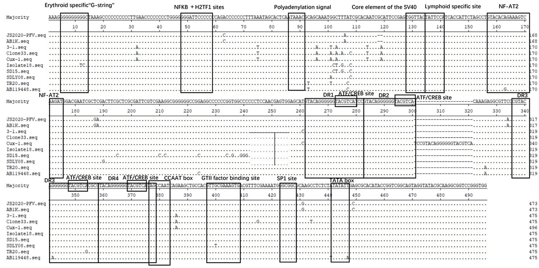 Structural analysis of the non-coding region of JS2020-PFV strain and reference strains. The sequences in black frames are the motifs of transcriptional regulatory elements in this study.