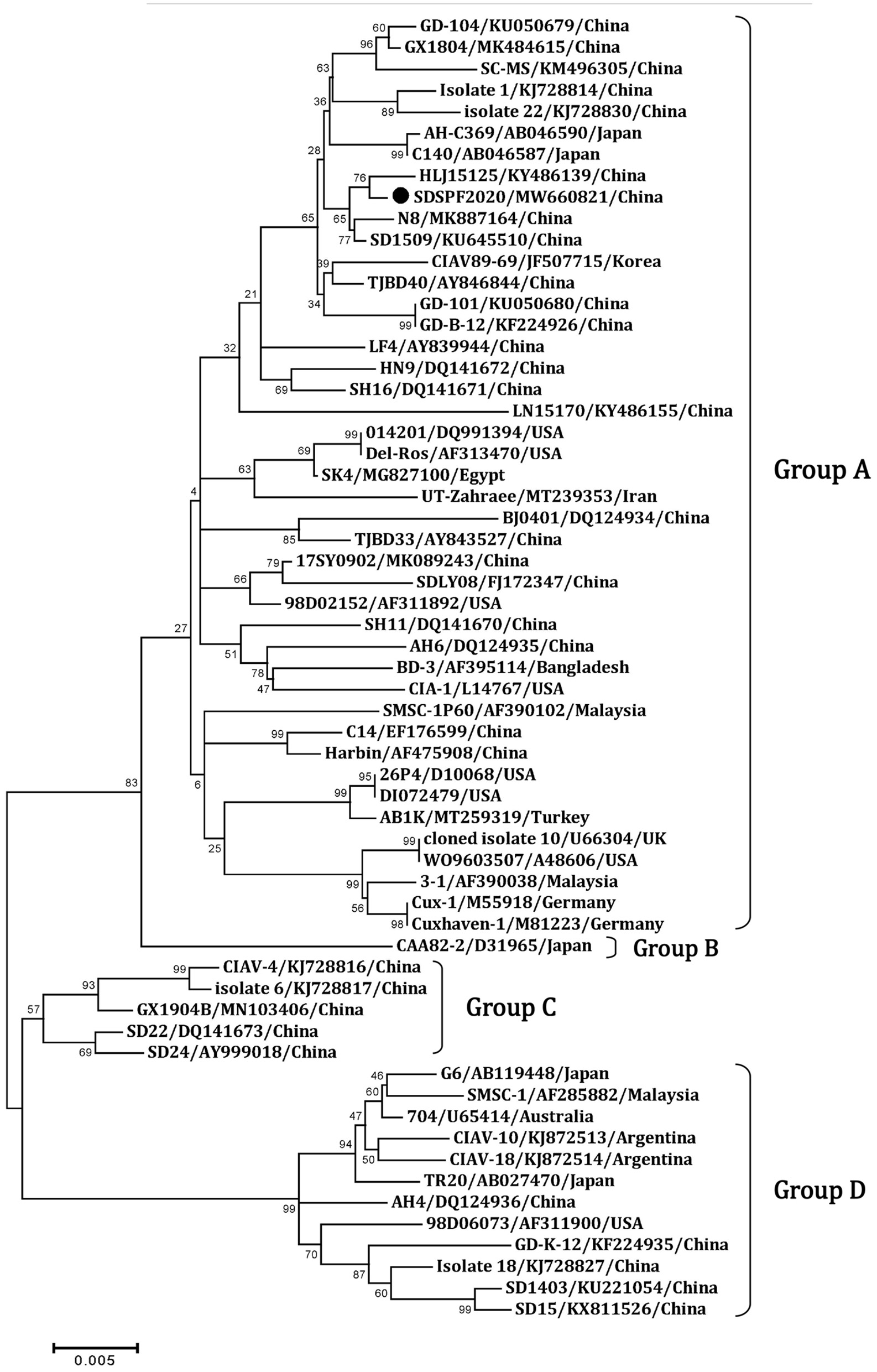 Li Y, Wang J, Chen L, Wang Q, Zhou M, Zhao H, Chi Z, Wang Y, Chang S and Zhao P (2022) Genomic Characterization of CIAV Detected in Contaminated Attenuated NDV Vaccine: Epidemiological Evidence of Source and Vertical Transmission From SPF Chicken Embryos in China. Front. Vet. Sci. 9:930887. doi: 10.3389/fvets.2022.930887