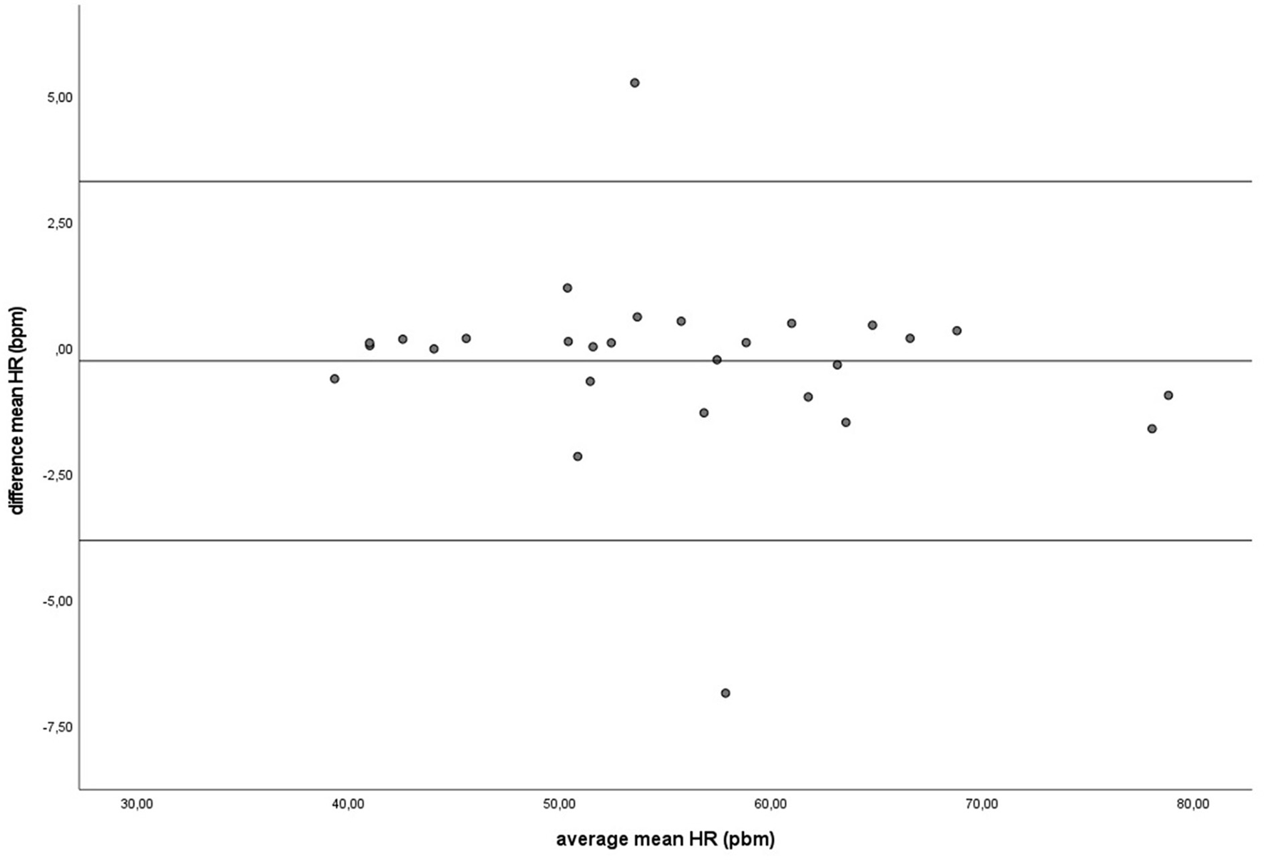 The Bland-Altman plot for the mean heart rate in beats per minute during baseline measurement, with the difference between sampling methods (y-axis) plotted against the mean of the two methods (x-axis). Each data point represents an individual horse (n = 28). The solid lines represent the upper and lower limit of the 95% confidence interval, respectively and the middle line represents the mean difference.