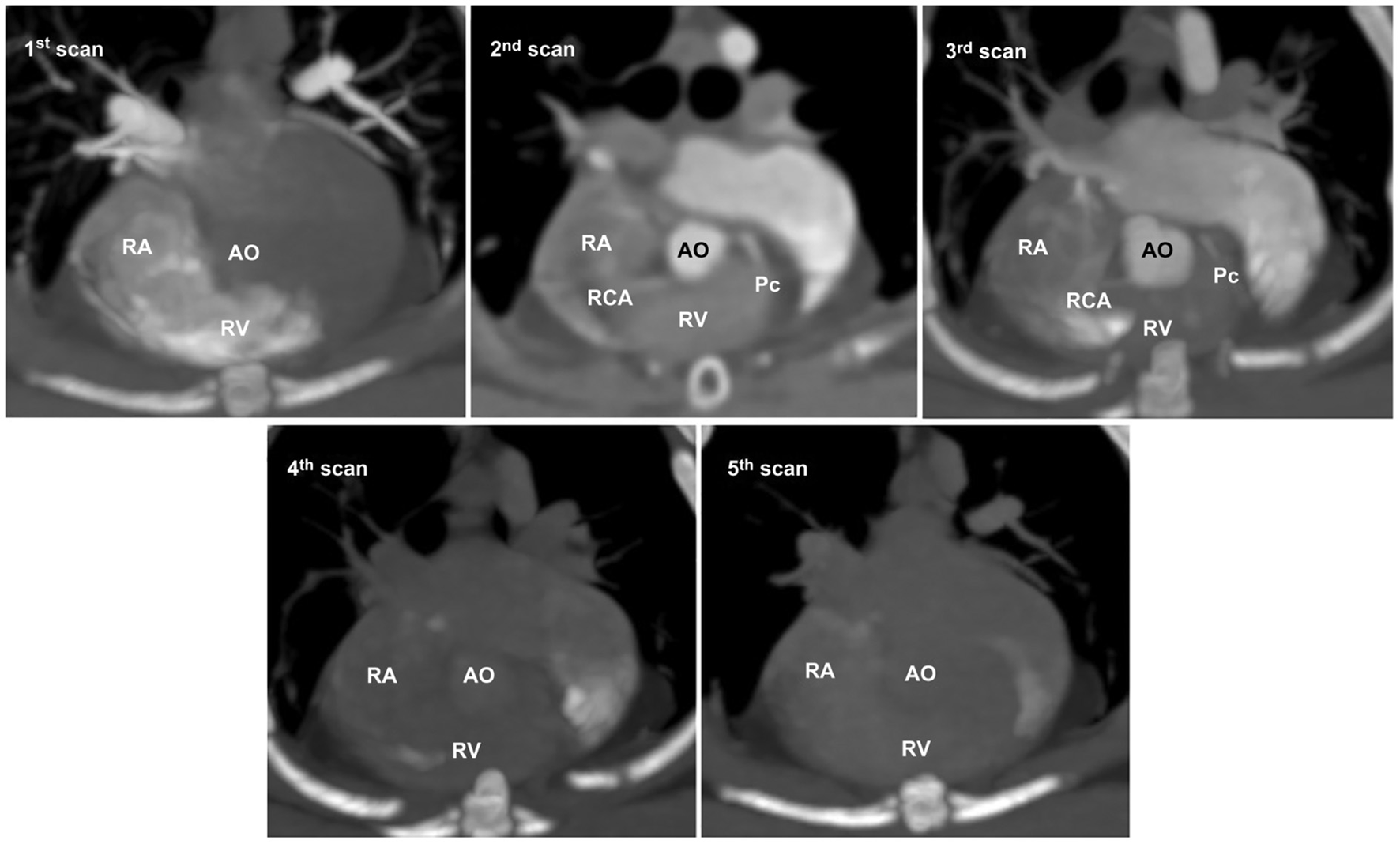 Five representative sequential non-electrocardiography (ECG)-gated multidetector computed tomographic (MDCT) images. In non-ECG-gated images, the first image shows no contrast enhancement in the left heart. The second and third images allow visualization of the left and right main coronary stems at the origin but produce non-diagnostic images for evaluating the detailed course of the coronary arteries owing to severe cardiac motion and blurring. The fourth and fifth images show poor opacification owing to the wash-out of the contrast medium. AO, aorta; Pc, paraconal interventricular branch; RA, right atrium; RCA, right coronary artery; RV, right ventricle.