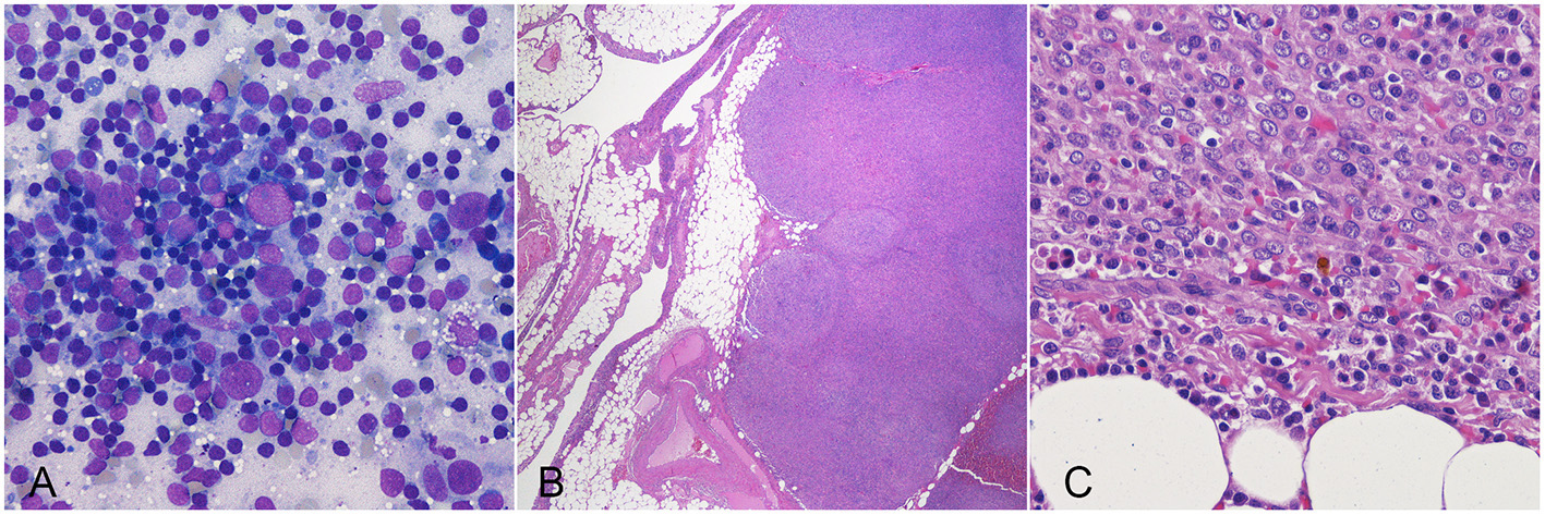 Dog, cytologic (A) and histologic (B,C) preparations of hepatic (A) and omental (B,C) metastasis from a splenic tumor. Lesions are composed by a pleocellular infiltrate of atypical stromal cells, histiocytes and lymphocytes, similar to the primary lesions.