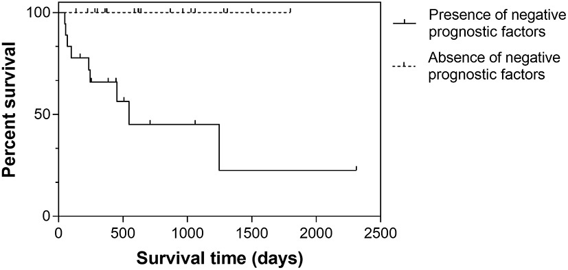 Kaplan-Meier survival curves in 37 dogs with splenic nodular lesions composed of a mixed stromal, histiocytic and lymphoid population. Cases were stratified according to the presence or absence of negative histologic prognostic factors (i.e., stromal cell atypia and at least one of MC ≥9, presence of karyomegaly/multinucleated cells, and lymphoid component <40%).