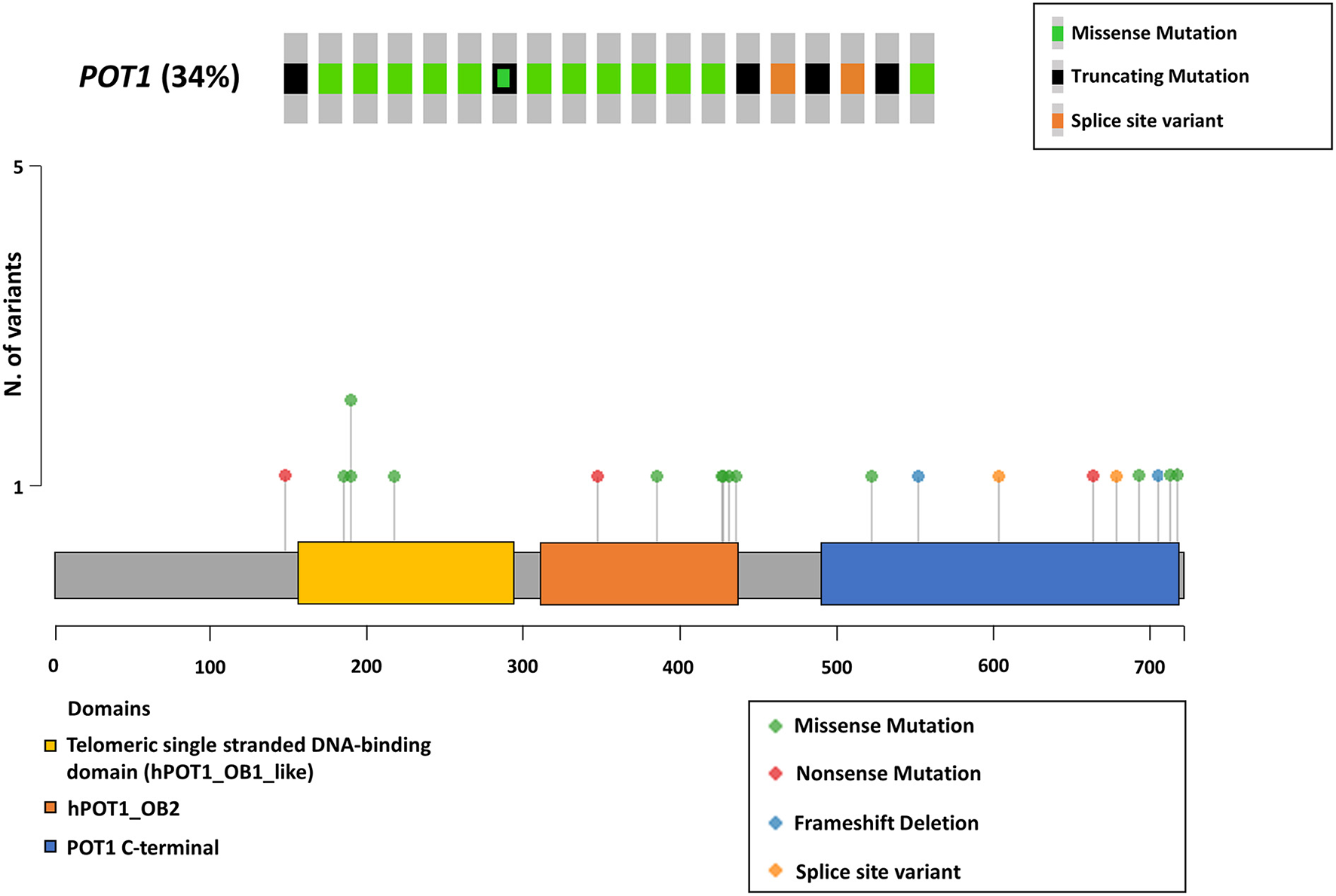POT1 somatic mutations. The upper panel shows dogs harboring a protein coding somatic mutation in POT1 gene. Frameshift and non-sense variants are both indicated as truncating mutations. The Oncoprint was generated using the Oncoprinter tool from cBioPortal (https://www.cbioportal.org/oncoprinter). The lower panel shows the lollipop plot of mutations retrieved in the study cohort. The height of each bar represents the frequency at which each mutation occurred. Functional protein domains are also depicted. The lollipop plot was generated using the maftools R package and modified to adapt to canine protein (F1P716_CANLF from UniProt).