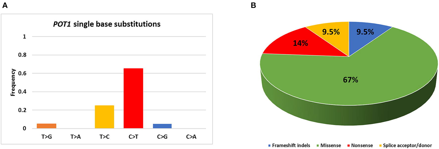 Summary of POT1 mutations identified in the present study. (A) Percentage of single base substitutions; (B) Percentage of mutations belonging to each class.