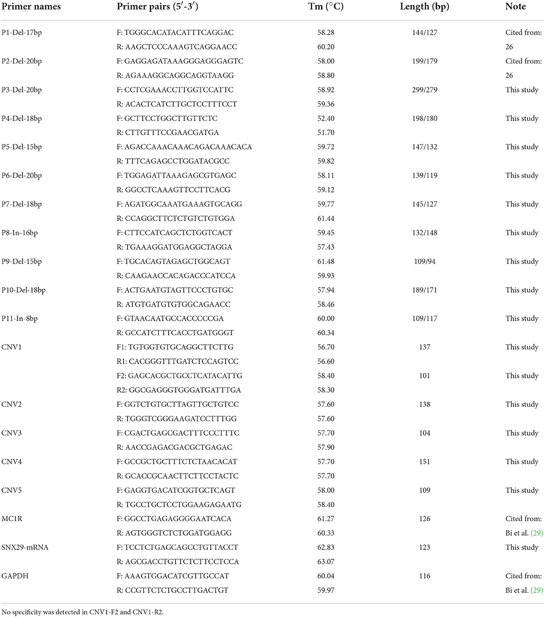 We searched the Ensembl (https://asia.ensembl.org/) and Animal Omics database (http://animal.nwsuaf.edu.cn/), and found 11 InDel and five CNV loci of the SNX29 gene in goats. Then, 16 primer pairs for amplification were designed using the Primer-BLAST tool in the NCBI database (https://www.ncbi.nlm.nih.gov/tools/primer-blast/) and the primer premier 5.0 software (Thermo Scientific, Waltham, MA, USA) (Table 1). Besides, four pairs of primers including P1-Del-17bp (Rs659002477, TAAAGGAAAGCAATGTA/-), P2-Del-20bp (Rs654310334, AGCTTCCGGTGAGCCTGTCG/-) (30), MC1R, and GAPDH (30, 31) were referred to our previous studies. MC1R and GAPDH were used as reference genes.