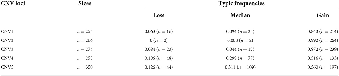 The primers were tested to ensure the that designed primers could amplify the target fragment (Supplementary Figure S1). Then, a total of 1,402 samples were used for testing. The total qPCR reaction system consisted of 10 μl comprised 5 μl of 2 × SYBR Premix Ex Taq (Takara, Dalian, China), 0.5 μl of DNA, 0.5 μl of each primer, and 3.5 μl of ddH2O. Previously explored experimental procedures were as follows, 95°C for 45 s, 40 cycles of 15 s at 95°C and 45 s at 60°C. Finally, the result was processed by method 2*2−ΔCt·2*2−ΔCt>2 was Gain, it < 2 was Loss, it = 2 was Median genotype (29).