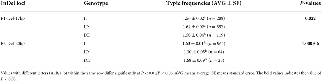 To further investigate the effect of SNX29 on reproduction, we screened the genetic variations of SNX29 and found that two InDel sites were polymorphic (P1-Del-17bp, P2-Del-20bp) among 11 pairs of primers. In the 17 bp deletion (n = 1,004), the frequency of ID genotype was much higher than that of II and DD. In the 20 bp deletion (n = 1,053), the number individuals with II genotype were much higher than the others. Besides, the P1-Del-17bp and P2-Del-20bp identified in the SNX29 gene were not consistent the HWE (P < 0.05). According to PIC values, the detected SNX29 P1-Del-17bp showed medium genetic diversity, while P2-Del-20bp exhibited low polymorphism in SBWC goats.