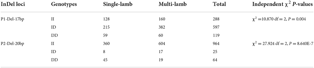 It has been found that two InDel loci were related to litter size by association analyses. The 17 bp deletion (P = 0.022) and the 20 bp deletion (P = 1.000E-6) within the SNX29 gene were discovered to be significantly associated with litter size, in which individuals the DD genotype of P2-Del-20bp (P < 0.01) and the ID genotype of P1-Del-17bp (P < 0.05) had larger litter size (Table 3; Figure 4). Moreover, the χ2 test showed that the genotype distribution of P1-Del-17bp (χ2 =10.870, P = 0.004) and P2-Del-20bp (χ2 = 27.924, P = 8.640E-7) were distinct between mothers of single-lamb and multi-lamb in 2,057 SBWC goats (Table 4; Figure 5).