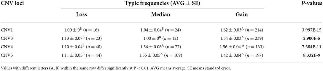 There were five CNV loci in the goat genome, and four of them (CNV1, CNV3, CNV4, CNV5) showed three variant types, while CNV2 had one variant type in SBWC goats. In four loci, the individual number of Gain genotype (CNV1 = 214, CNV3 = 239, CNV4 = 133, CNV5 = 197) was higher than Loss and Median, and the Gain frequencies in four sites (CNV1 = 0.834, CNV3 = 0.872, CNV4 = 0.516, CNV5 = 0.563) were significantly higher (Table 2).