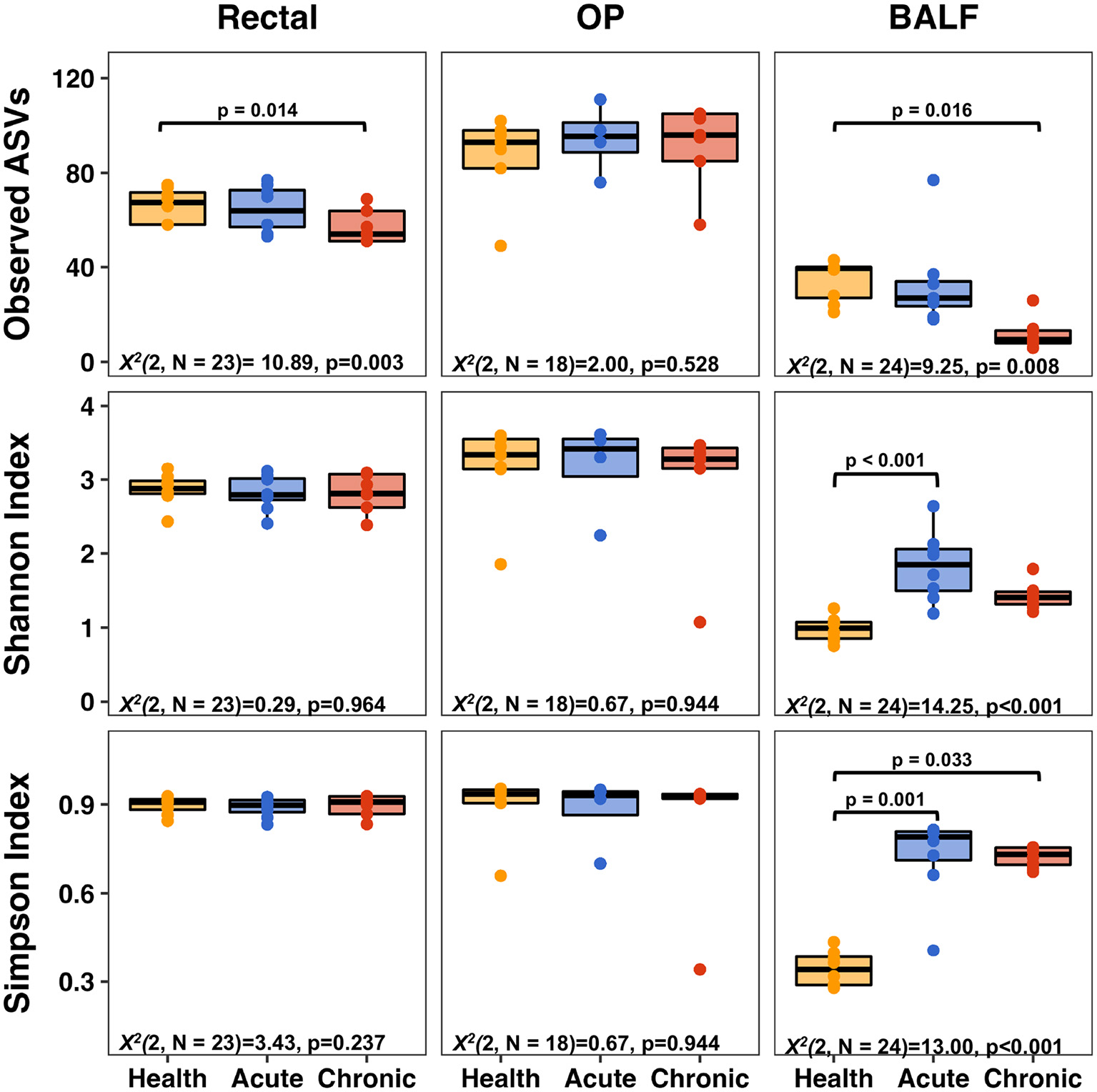 Alpha diversity metrics—richness (top row), Shannon Index (middle row), and Simpson Index (bottom row) of rectal (left column), upper airways (OP, middle column) and lower airways (BALF, right column). Significant decreases in richness were observed in BALF and rectal samples when comparing health to chronic asthma. Within sample diversity in BALF was significantly increased in acute and chronic asthma. OP, oropharyngeal; BALF, bronchoalveolar lavage fluid.