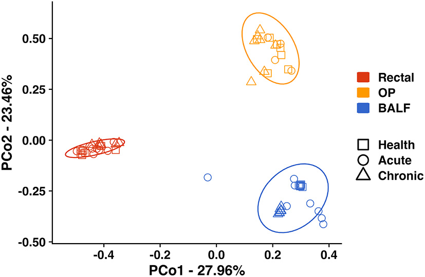 Principal coordinate analysis including all sites—Principal coordinate analysis of Bray Curtis similarity index including all sites (Rectal—red; OP—orange; BALF—blue) in health (squares), in acute asthma (6 weeks) (circles) and chronic asthma (36 weeks) (triangles) after experimental asthma induction showed significant differences in microbial community structure between sites. The ellipses represent a 95% confidence interval. OP, oropharyngeal; BALF, bronchoalveolar lavage fluid.