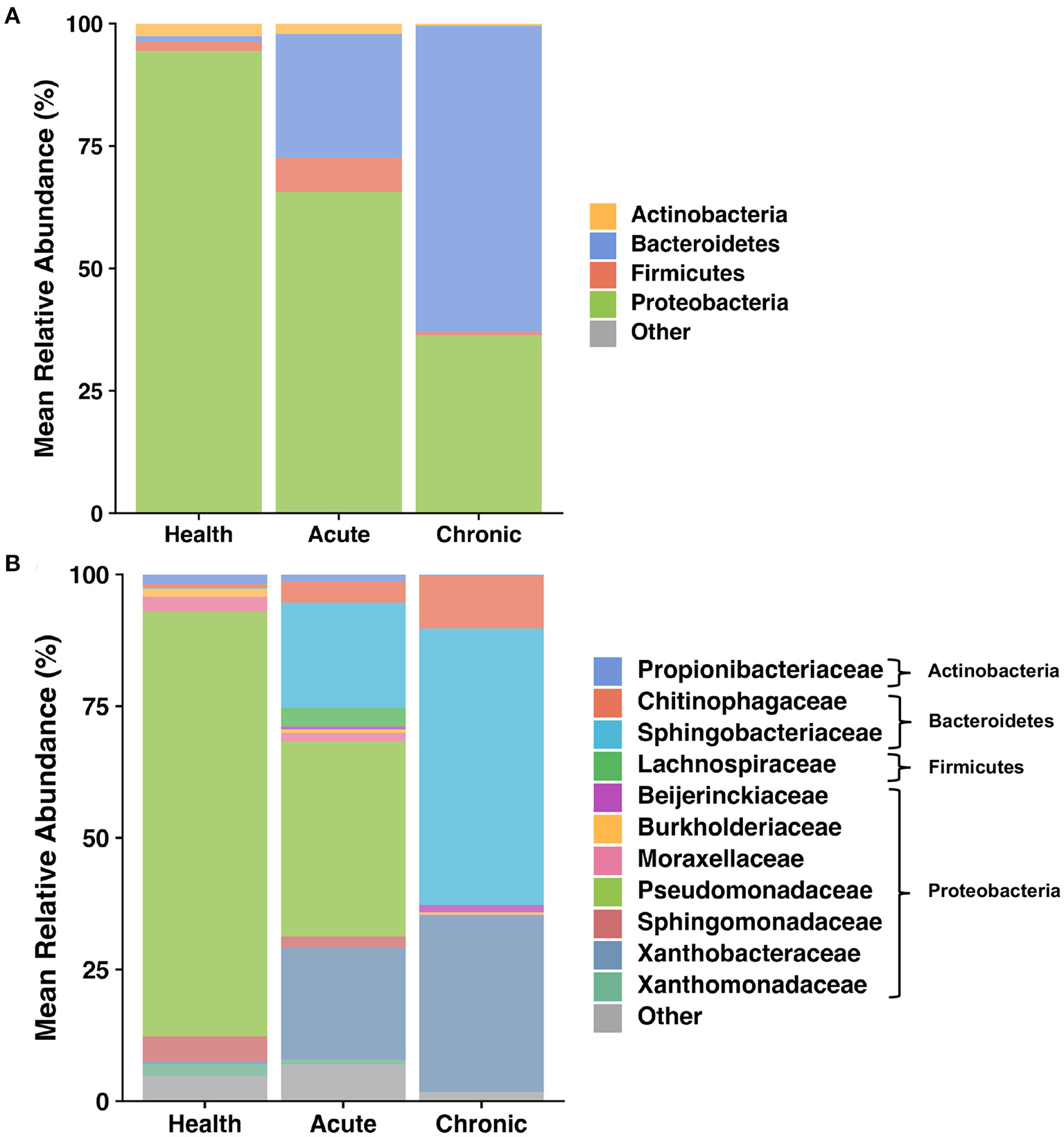 Taxa present in BALF—Mean relative abundance of taxa present at >1% in bronchoalveolar lavage fluid (BALF) collected as 8 cats transitioned from health to acute and chronic experimental asthma, annotated to the taxonomic level of phylum (A) and family (B).