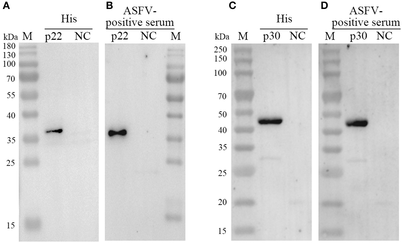 Determination the expression of p22 and p30. (A, C) The expression of p22 protein (A) and p30 protein (C) was determined by anti-His antibody. (B, D) The expression of p22 protein (B) and p30 protein (D) was immunoreactive with ASFV-positive serum.