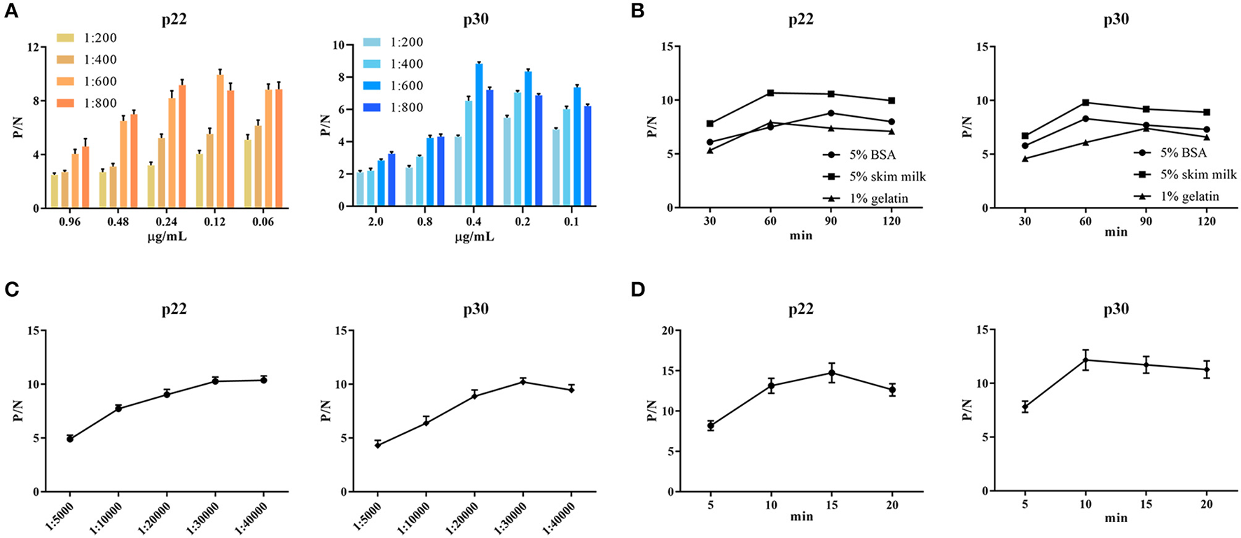 To determine the optimal conditions, the checkerboard titrations were performed. The results showed that the optimum coated concentration of p22 and p30 was determined at 0.12 and 0.4 μg/mL, and the optimum dilution ratio of serum as primary antibody was 1:600 (Figure 4A). For blocking conditions, we found compared with 5% BSA and 1% gelatin, using 5% skim milk for 60 min exhibited higher performed a higher blocking effect (Figure 4B). Moreover, the dilution ratio of secondary antibody and the reaction time of substrate-enzyme were explored. The result showed for p22, the optimum dilution of secondary antibody reached 1:40,000 (Figure 4C) and the optimum reaction time is 15 min (Figure 4D); for p30, the optimum dilution of secondary antibody was 1:30,000 and the reaction time of substrate-enzyme is 10 min (Figures 4C, D). To develop the indirect ELISA based p22 and p30, the coating ratio of both proteins were evaluated. Based on calculating P/N value, we found that the optimum volume ratio of p30 to p22 reached 1:3 (Table 2).