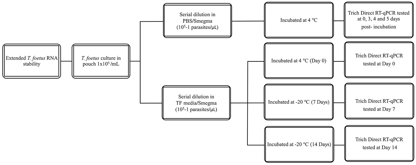 All dilutions were incubated at 4°C or 25°C for the given time points (0–3 days). The experimental design is shown in Figure 1. Then, they were assayed by qPCR and/or Trich direct RT-qPCR. For extended time points, only PBS was evaluated as no differences were observed at early time points in RNA stability in both media. The experimental design of extended stability is shown in Figure 2. Data are represented by three independent experimental replications for all time and temperature combinations.