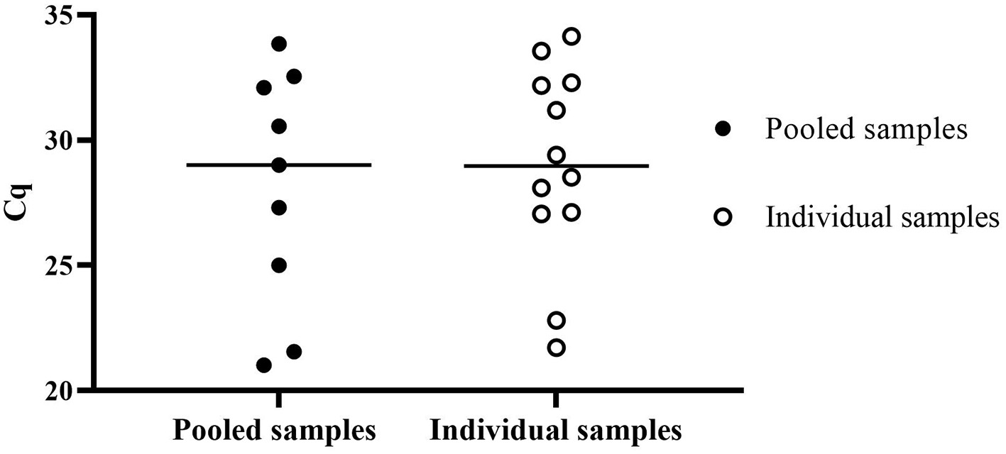 The evaluation of two types of collection media (PBS and TF transport tube) was conducted by collecting field smegma samples serially, in both media. A total of 44 samples were submitted by veterinarians to NVDC in April–May 2020, with each sample submitted in both media types. Received samples were pooled from the same farm with up to five samples per pool into a total of 10 pools. The result of individual samples (n = 44) indicated 100% positive agreement (95% CI: 20.7–100) and 100% negative agreement (95% CI: 91.8.0–100) in field samples collected in parallel for T. foetus testing between direct RT-qPCR and qPCR as shown in Table 3. A similar analysis was conducted with pooled samples (n = 10), and the result showed 100% positive agreement (95% CI: 20.7–100) and 100% negative agreement (95% CI: 70.1–100).