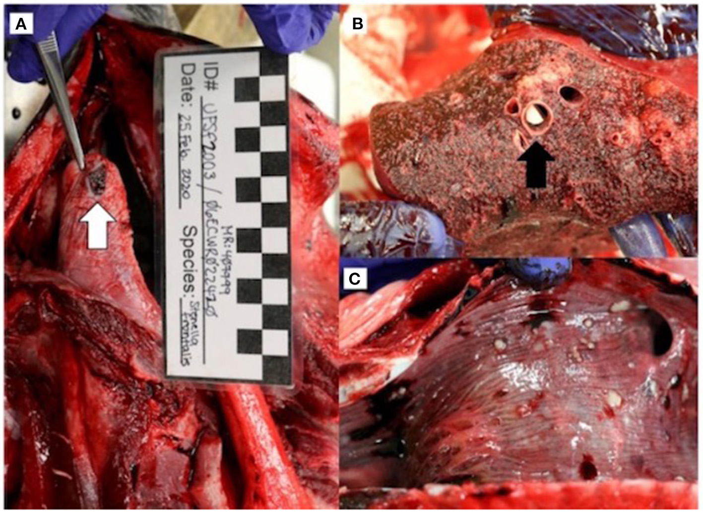 Gross necropsy findings in an adult male Stenella frontalis included a 1.0 x 0.8 cm ulcerated lesion (white arrow) on the ventral aspect of the tongue (A), lungs with multifocal to coalescing white raised nodules (B) with necrotic debris within bronchi (black arrow), and thick mucus and 1 to 4 mm free floating white debris in the anterior trachea (C).