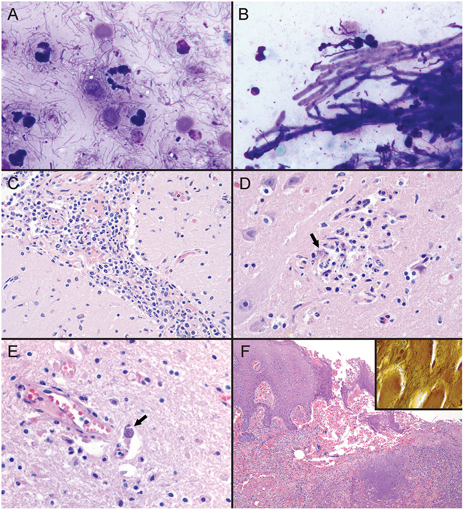 Tissue sections and imprint cytology from an adult male Stenella frontalis. (A) Imprint of tongue lesion. Mixed bacterial infection with suppurative inflammation, characterized by extracellular and phagocytosed mixed bacilli, diplococci, and spirilliform bacteria (1000x; hematoxylin and eosin stain [HE]). (B) Imprint of tracheal mucosa. There is a dense mat of septate branching fungal hyphae and mixed bacilli (1000x; HE). PCR on frozen lung tissue identified the fungus as Aspergillus fumigatus. (C) Photomicrograph of leptomeninges in cerebral sulcus. Mixed leukocytes, with a predominant population of lymphocytes and histiocytes expand the leptomeninges (400x; HE). (D) Photomicrograph of the right midbrain. Apicomplexan protozoa (black arrow) are present in a focus of malacia and gliosis (600x; HE). (E) Photomicrograph of right frontal cortex. Apicomplexan bradyzoites (black arrow) are adjacent to a vessel in the gray matter. Increased numbers of glial cells are scattered throughout the neuroparenchyma (600x; hematoxylin and eosin stain). PCR on frozen central nervous system tissue identified Sarcocystis speeri within the samples. (F) Photomicrograph of tongue lesion. There is regional ulceration of the glossal mucosa with a underlying bed of cellular and necrotic debris, and intact and degenerate neutrophils. HE; 100x. [Inset] Large numbers of spirilliform bacteria are present throughout the ulcerative lesion (600x; Warthin-Starry stain). PCR on frozen tongue tissue identified the bacteria as a Treponema sp.