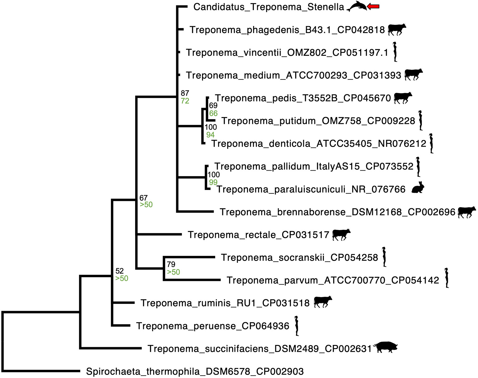 MAFFT alignment Bayesian phylogenetic tree representative of homologous 170 to 173 base pair 23S rRNA sequences of Spirochaetes closely related to a novel Treponema species identified from an ulcerative tongue lesion in a Stenella frontalis. The outgroup used was Spirochaeta thermophila (Genbank accession CP002903). Bayesian posterior probabilities are written in black, above the maximum likelihood bootstrap values, which are written in green. Both posterior probabilities and maximum likelihood bootstrap values were rounded to the nearest whole percent. The novel Treponema species (Candidatus Treponema stenella) is identified by a red arrow, Treponema spp. associated with bovids, humans, pigs or rabbits are identified by accompanying graphics of those species.